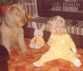 | Cleo Hongzinger sleeping in Adrienne Metzinger's hair. | Adrienne Metzinger (at 18 months) with her dog Tasha, an Airdale Terrier |