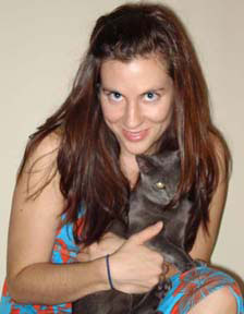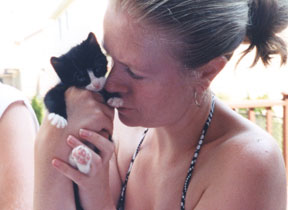 | Rachel Silverman (Owl, Grasshopper) with Romeo | Cleo Hongzinger with Adrienne Metzinger (Managing Director/Singer/Designer) just after being rescued from the street: Too small to have been separated from her mother. |