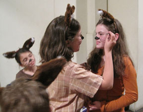 | Claire Molloy (Viven) and Sara Paar (Fox) | Columbine Loza assists Chloe Pitkoff with her fox makeup |