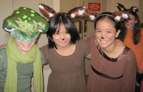 | Rachel Silverman (Grasshopper) and Erica Mundy (Cricket) | Anita Moore puts some attitude behind her Hen characterization. Fox Cub Columbine Loza looks on |
