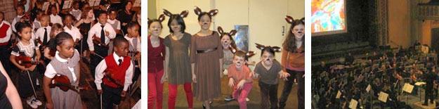 LEFT: Photo by Kenson Noel, Students from Harlem Children’s Zone performing Holst’s The Planets with One World Symphony. CENTER: Student performers in Janacek’s The Cunning Little Vixen. RIGHT: One World Symphony performs The Rite of Spring with artwork by Harlem Children’s Zone students.