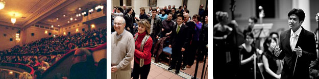 LEFT: Photo by Ron Metzinger. One World Symphony’s sold-out performance at New York’s historic Town Hall. CENTER: Photo by Jaka Vinšek, Audience enjoys an impromptu group back rub during intermission. RIGHT: Photo by Jaka Vinšek, Sung Jin Hong interacting with audiences.