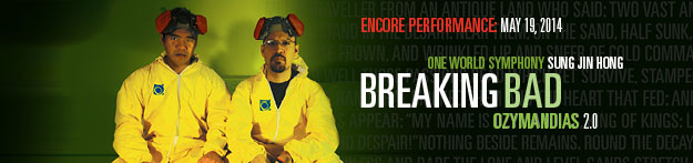 One World Symphony will perform the world premiere Breaking Bad — Ozymandias on January 26 and 27, 2014. Inspired by Percy Bysshe Shelley's sonnet and the award-winning drama, composer-conductor Sung Jin Hong's mini-opera explores the question that the drama obsessively and hauntingly asked: "are we all breaking bad?" Hong's recently critically-acclaimed compositions include the symphonic poem The Architect (2012) and works for vocalists and symphony orchestra, such as Edge (2013), a monodrama based on Sylvia Plath's final poem, and Rite of the Cicada (2013), inspired by the re-emergence of Magicicadas Brood II.