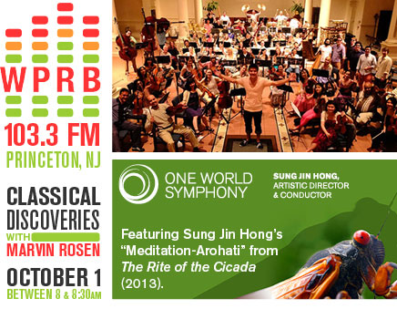 On October 1, 2014 between 8:00 and 8:30 AM, Classical Discoveries with Marvin Rosen on WPRB at Princeton, NJ will air Sung Jin Hong's “Meditation-Arohati” from the Rite of the Cicada (2013). The recording is from the live unedited world premiere performance by One World Symphony under the guidance of composer-conductor Sung Jin Hong. Inspired by the re-emergence of Brood II Magicicadas, the symphonic-poem is scored for vocal soloist, large symphony orchestra and audiences.